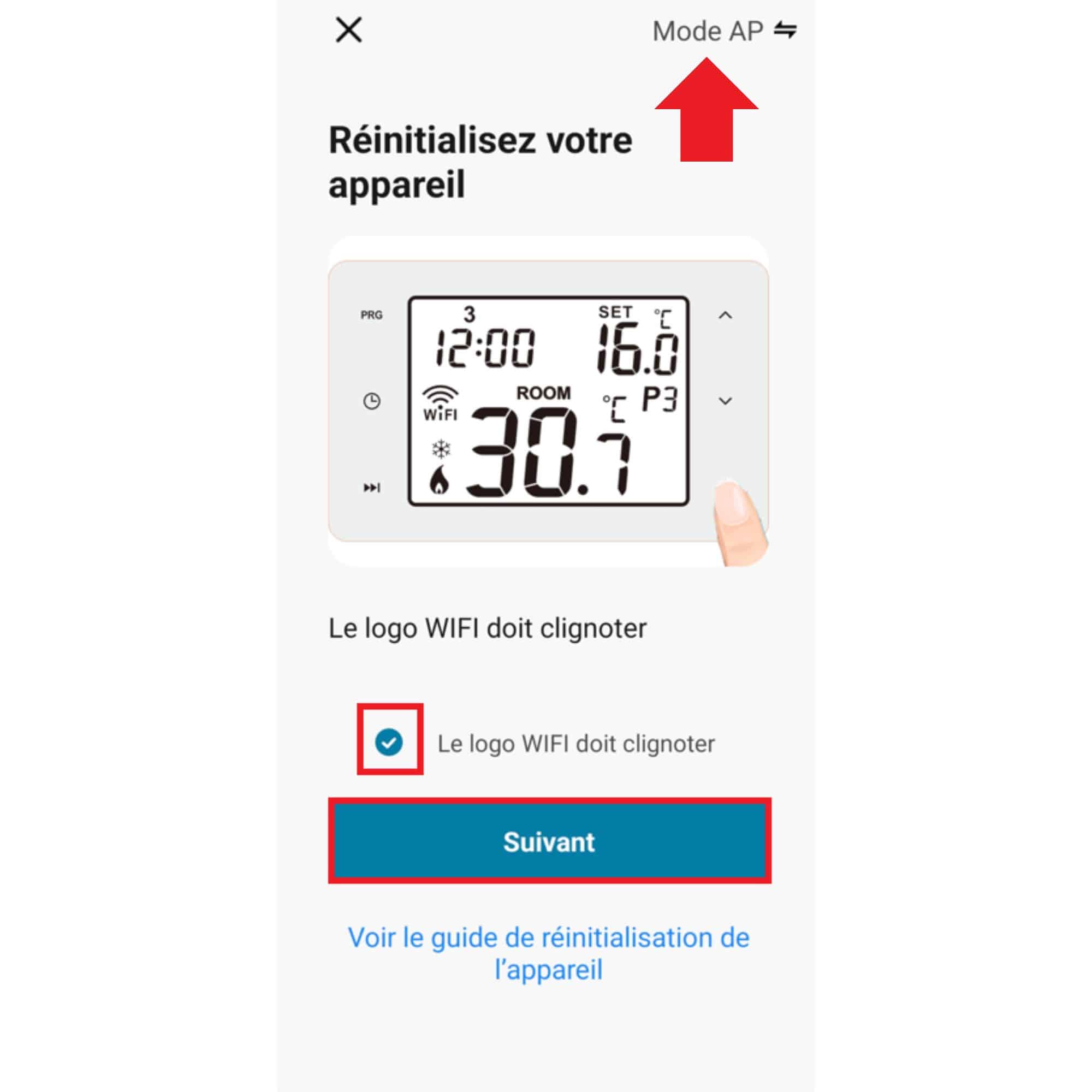 Assurez vous que l’indication AP soit présent sur votre thermostat. Suivant la génération, il est possible qu’aucune indication ne soit présente en plus de COFI.