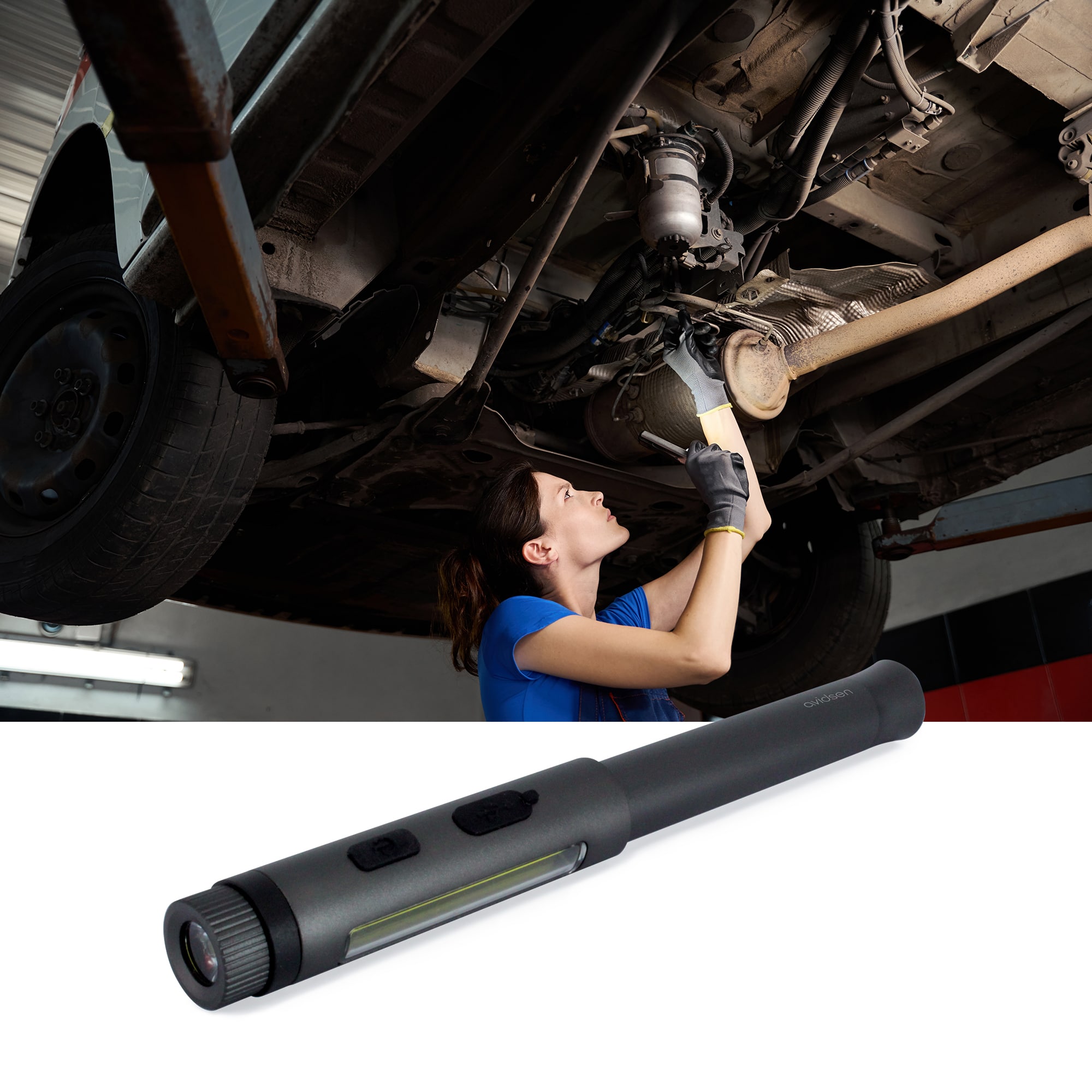 Com o seu tamanho compacto (171 x 19 mm, 79 gramas), a lâmpada é fácil de guardar e transportar. A sua poderosa base magnética permite-te fixá-la a qualquer superfície metálica. Com a luz acesa, podes continuar as tuas actividades com as mãos-livres.