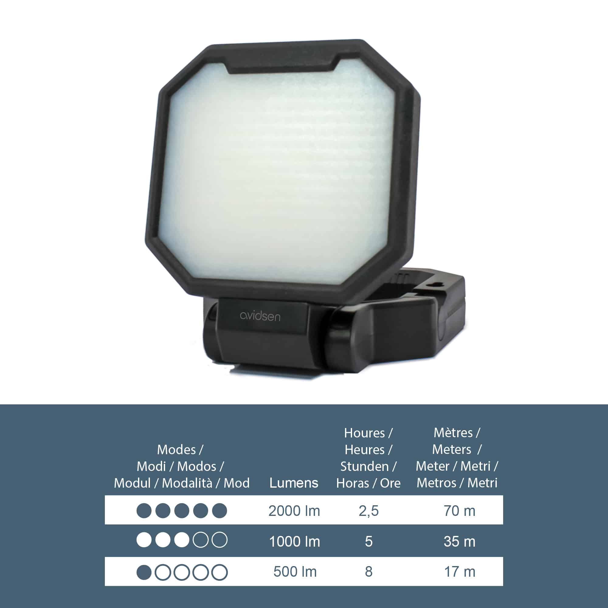 Trabalha ou diverte-te com as mãos-livres, mantendo-te bem iluminado graças a este projetor LED recarregável da Avidsen, que oferece 2000 lúmenes de potência com três modos de iluminação. Também tem uma função de bateria externa incorporada, para que possas recarregar um telemóvel ou qualquer outro objeto alimentado por bateria.